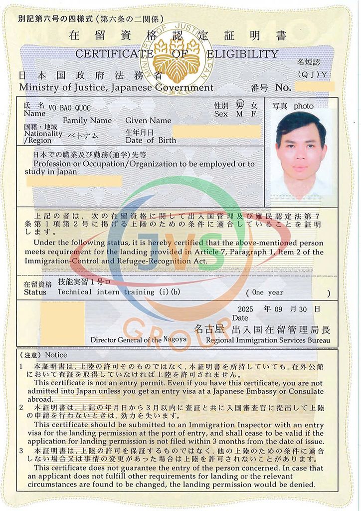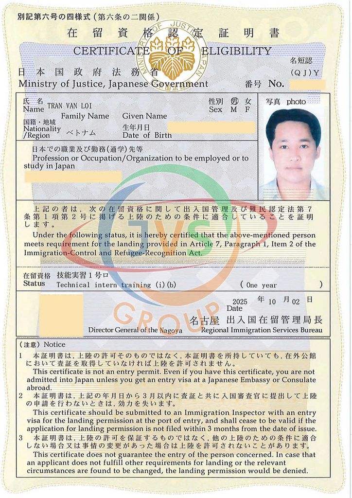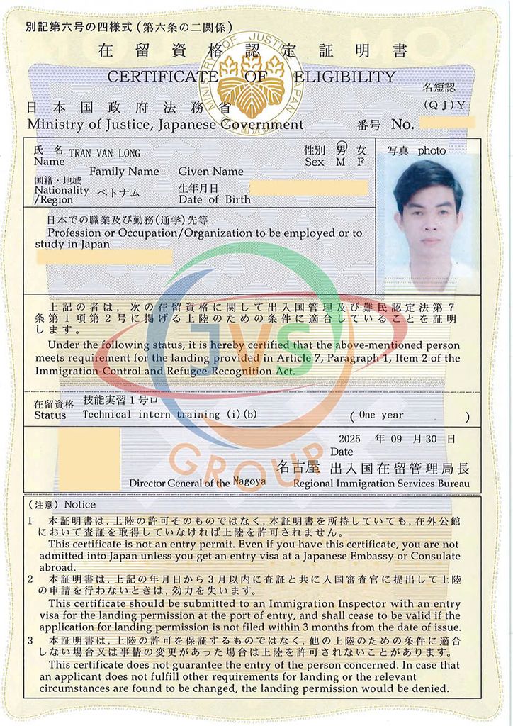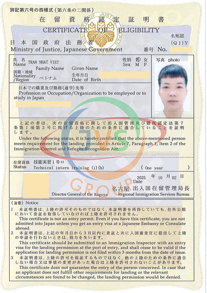 2025年11月17日 ベトナムの取引先である「JVSグループ」の実習生6名に「機械検査」の在留資格認定証明書が下りました。