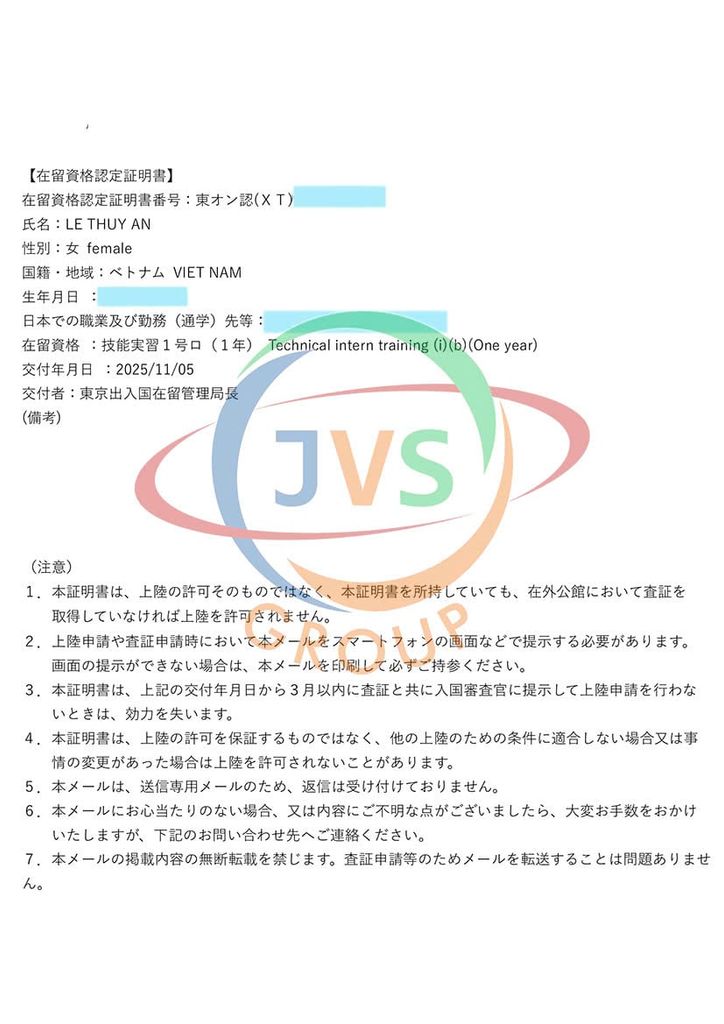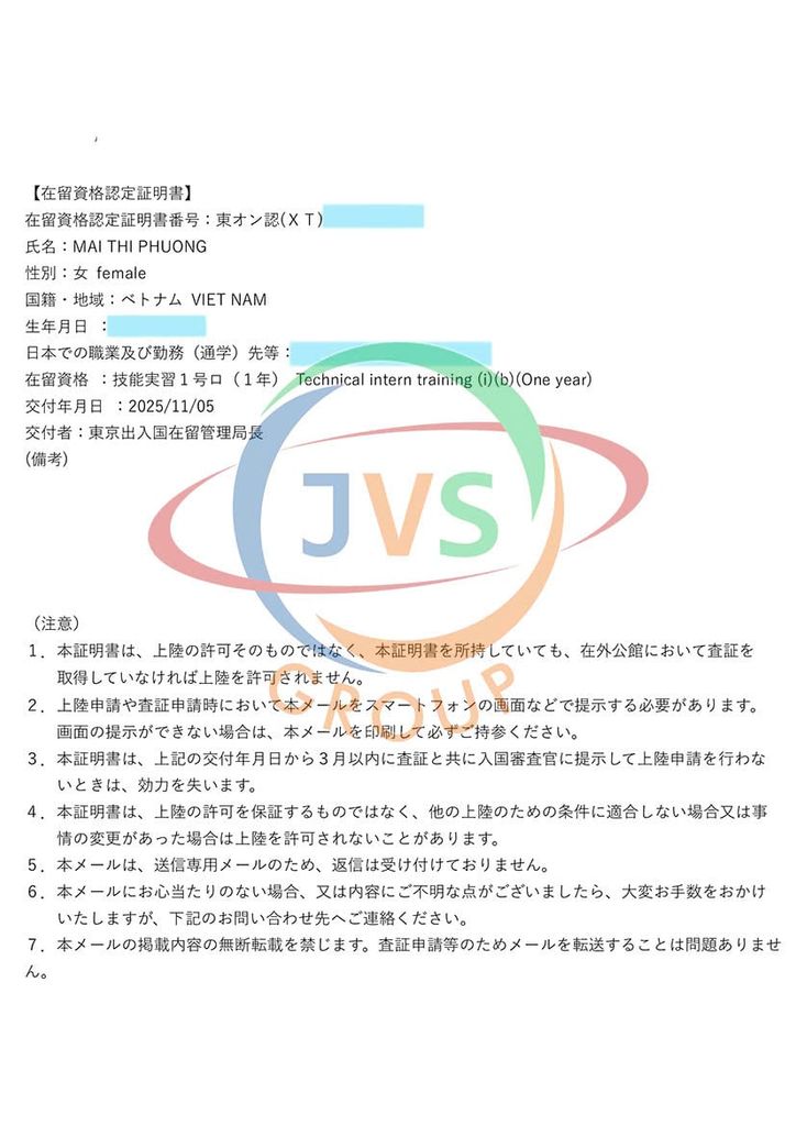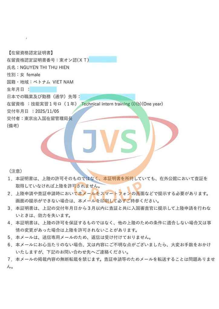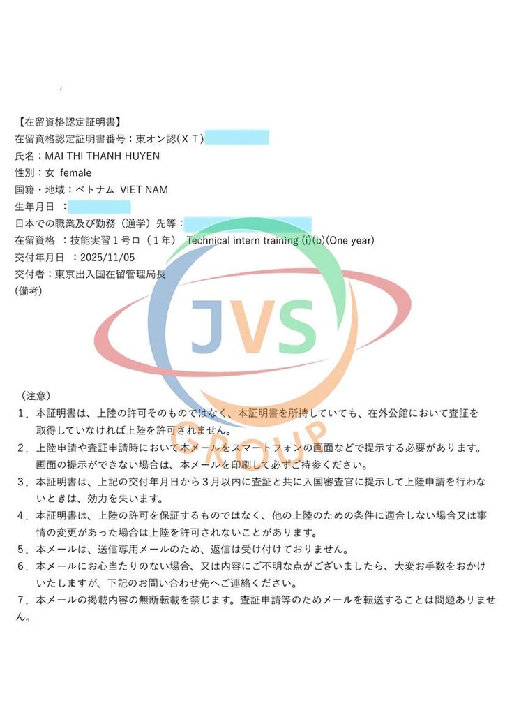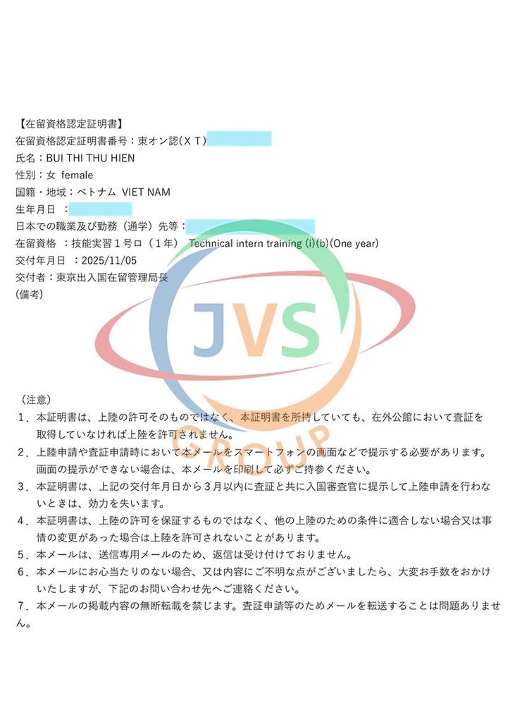 2025年11月6日 ベトナムの取引先である「JVSグループ」の実習生7名に在留資格認定証明書が下りました!!!
